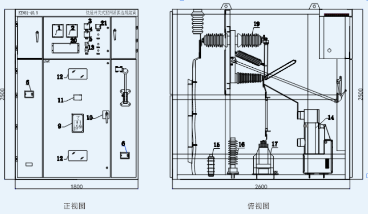 1.微机消谐装置 2.消弧控制器 3.电压表 4.电流表 5.电压转换开关 6.照明装置 7.辅助开关 8.操作机构 9.模拟指示牌 10.电磁锁 11.铭牌 12.观察窗 13.消弧投退转换开关 14.分相接地开关 15.导体式强阻尼抑制器 16.过电压保护器 17.电压互感器 18.高压熔断器19.隔离开关 20.小电流选线装置 21.温湿度控制器 |