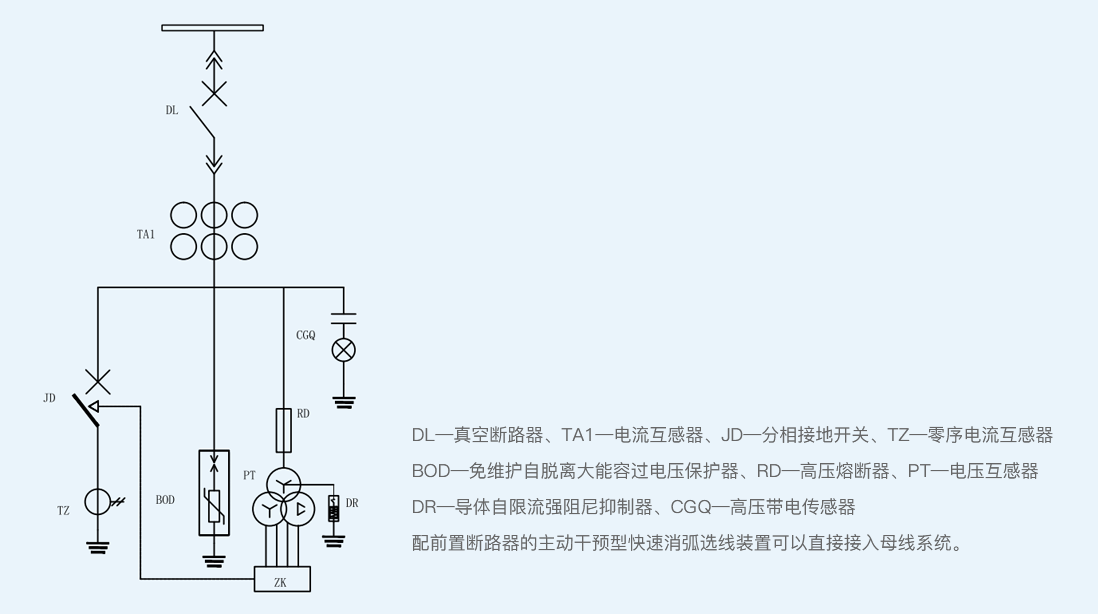 1.消弧控制器 2.微机消谐装置 3.综保 4.前级断路器(隔离手车) 5.电流互感器 6.PT高压熔断器 7.限流型强阻尼抑制器 8.电压互感器 9.自脱离过电压保护器 10.零序电流互感器 11.分相接地快速断路器 |