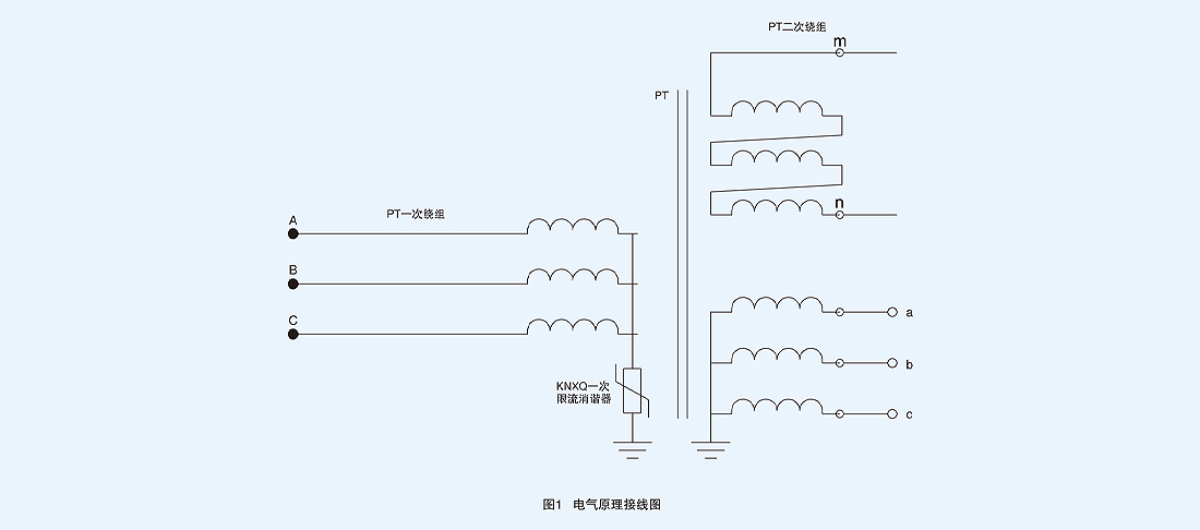 如图1所示,本产品需要串联在电压互感器中性点与接地带之间,正常运行状态下电阻值一般不大于40kΩ,而电压互感器一次绕组的激磁电抗为数百千欧到兆欧级,不会影响电压互感器及其二次设备的计量精度,也不会增大继电保护及自动装置的测量误差。