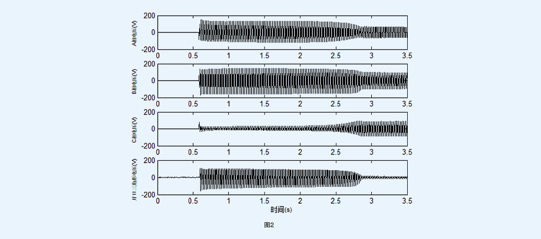 当一相或两相电压互感器发生饱和或发生铁磁谐振后,流过SHK-SIDR型导体式强阻尼自限流抑制器的电流迅速增大,靠本身独特的物理特性电阻值迅速增大,大幅度改变系统零序参数,破坏铁磁谐振条件,靠其强大的阻尼作用消耗谐振能量。图2为本产品消谐过程的实录波形。