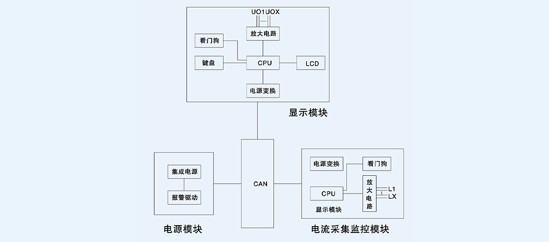 如图所示,SHK-DX型超准小电流选线装置主要由电源模块、电流采集模块和显示输出模块组成。